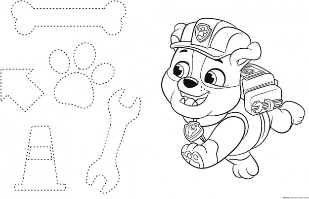 D’un côté, une scène colorée avec les héros de PAW PATROL, de l’autre un coloriage et un petit jeu avec des éléments à colorier.