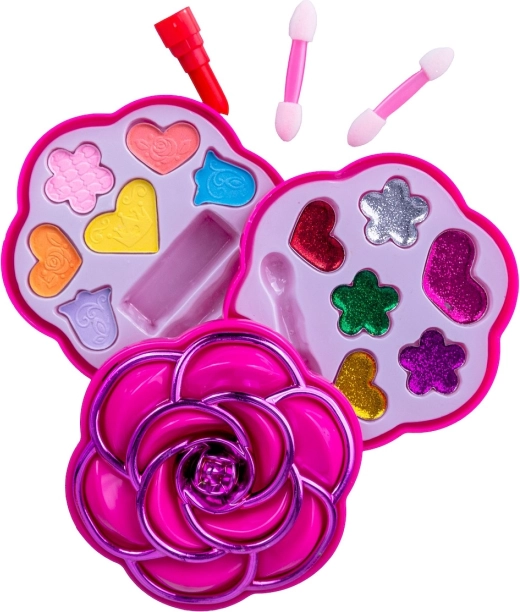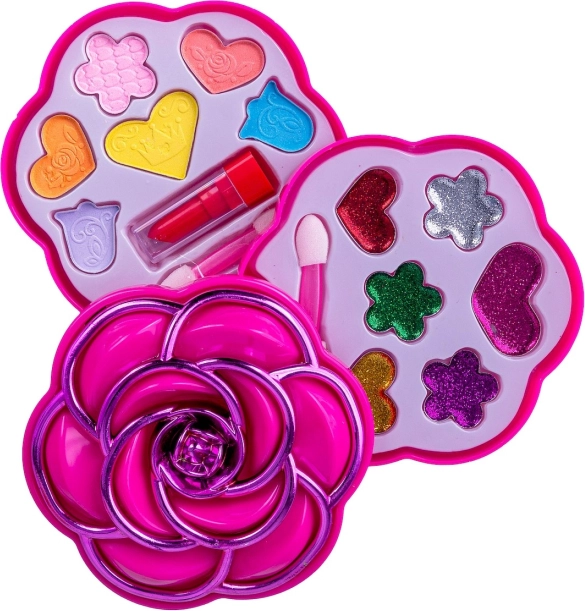 Adorable coffret cosmétique pour petites princesses en forme de fleur, idéal pour faire ses premiers pas dans l’univers du maquillage. Il comprend deux étages de fards à paupières – paillettes et effet lamé ainsi que des teintes pastel – et un rouge à lèvres rouge. L’étui compact dans la couleur rose préférée se glisse facilement dans le sac d’une petite demoiselle une fois fermé.