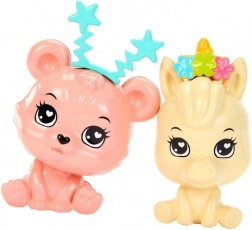 Deux figurines animales – un ours rose et un cheval beige – complètent l'ambiance de la fête d'anniversaire.