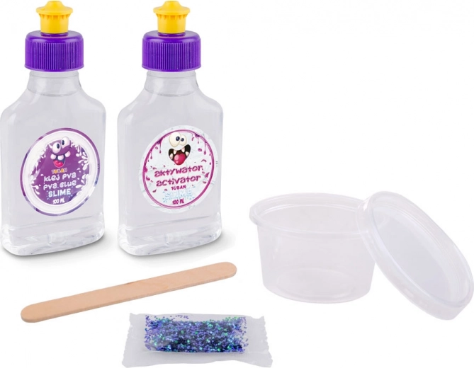 Colle PVA, activateur, paillettes, mélangeur et gobelet refermable – prêt à l’emploi pour créer un slime étincelant.