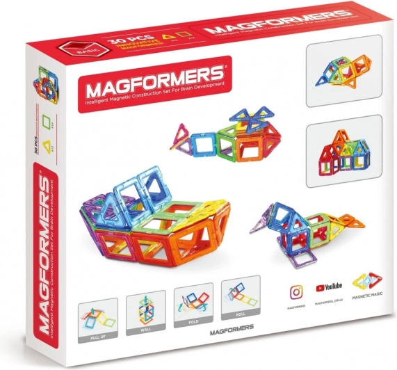Magformers Basic 30 sont des blocs dotés d’aimants au néodyme puissants intégrés, qui s’attirent toujours mutuellement. Il suffit d’approcher deux blocs par leurs faces pour qu’ils se connectent instantanément. Grâce aux blocs façonnés selon des formes géométriques, vous pouvez construire de magnifiques structures tridimensionnelles. Pour jouer, vous pouvez utiliser le guide inclus, d’autres exemples disponibles sur magformersworld.com, ou votre propre imagination. Le set comprend : 12 triangles ; 18 carrés.
