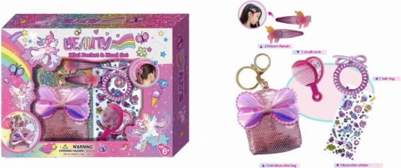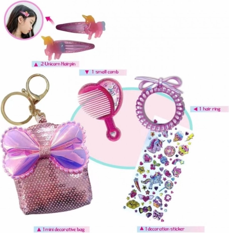 - Trousse pailletée avec nœud (utilisable comme porte-clés), 2 barrettes licorne, petit peigne, élastique spirale, planche d’autocollants