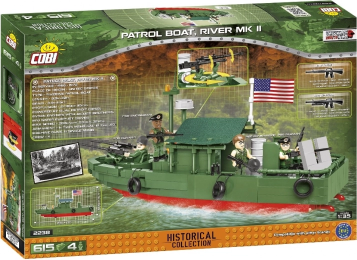 La vedette PBR est une icône de la guerre du Viêt Nam — légère, rapide et à faible tirant d’eau grâce à sa coque en stratifié et à sa propulsion par hydrojet. La réplique de ce kit restitue fidèlement ses lignes, son équipement et ses nombreux détails, notamment la double affût M2HB de 12,7 mm à l’avant, l’armement arrière et les accessoires de l’équipage. Le tout est complété par une bâche textile qui confère au modèle un aspect authentique.