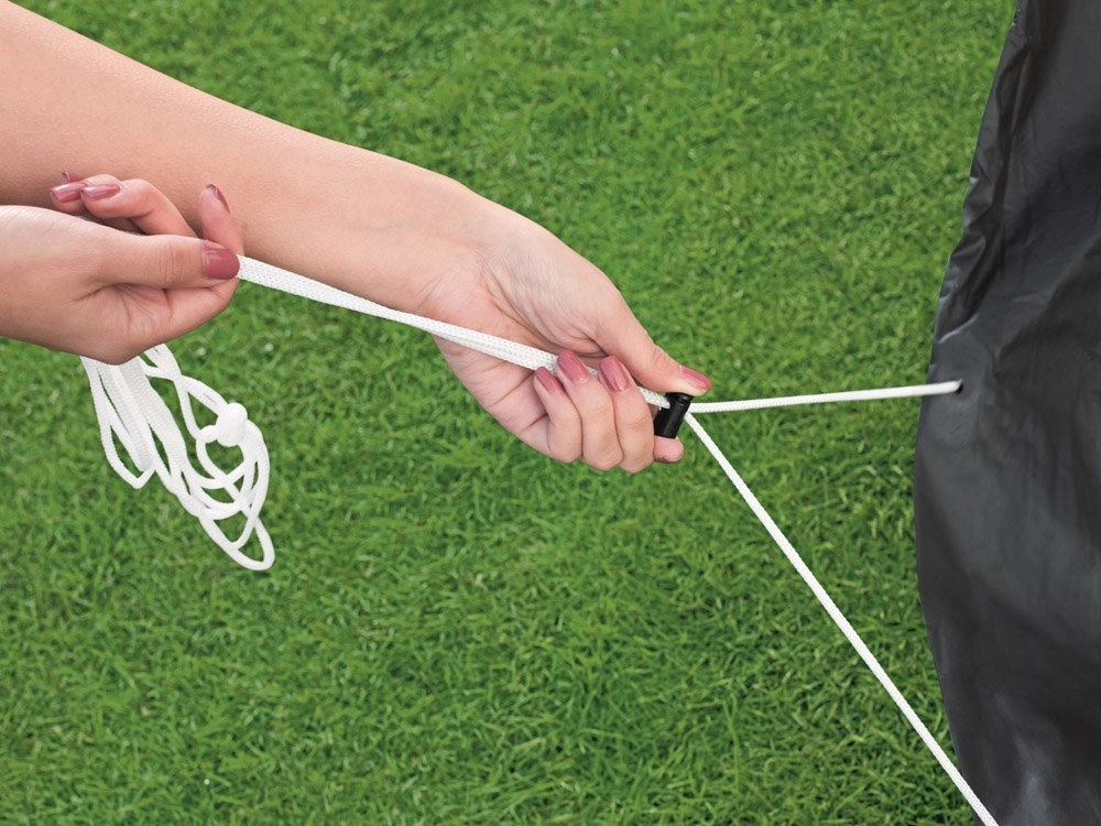 Des cordons de fixation à serrage facile maintiennent fermement la bâche en place pour qu’elle ne soit pas emportée par le vent. Installation et retrait rapides, sans outils.