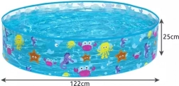 Les spécifications de la piscine incluent une capacité de 277 litres et des dimensions de 122 cm x 25 cm, ce qui est idéal pour les jeunes enfants. Le produit pèse seulement 950 g, il est donc facile à manipuler et à transporter. Un patch de réparation étanche est inclus dans l'emballage, permettant des réparations rapides même lorsque la piscine est remplie d'eau.