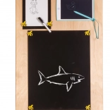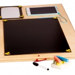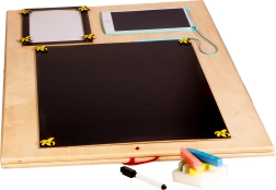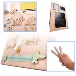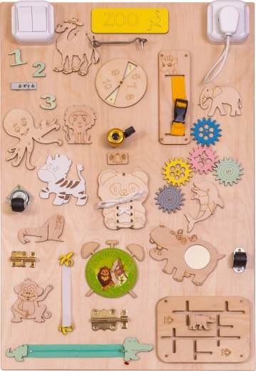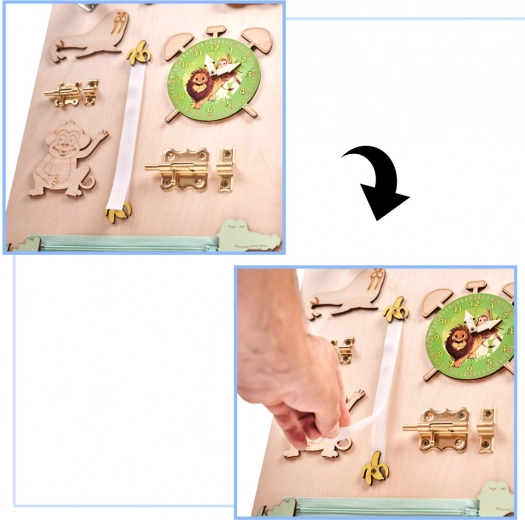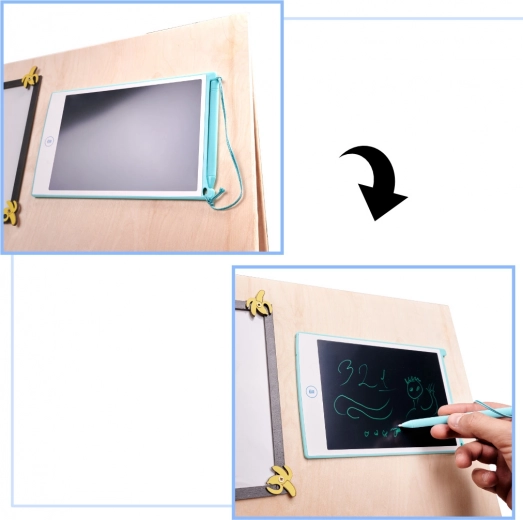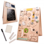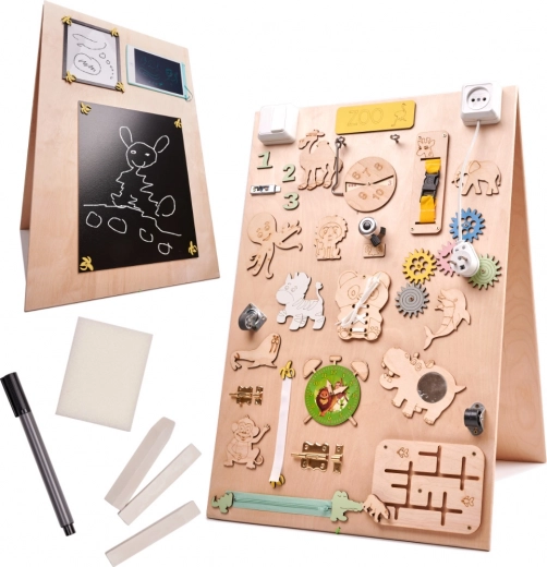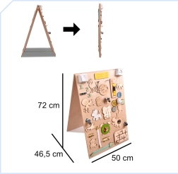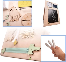 La caractéristique unique de cette planche est sa réversibilité - un côté contient de nombreux éléments manipulables et l'autre sert de surface pour dessiner et écrire avec des craies, des marqueurs ou des crayons. Cela aide les enfants à développer leur créativité et leur motricité fine.