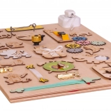 La planche contient des roues dentées colorées, des cloches, des cadenas et d'autres éléments interactifs qui soutiennent le développement de la motricité fine.