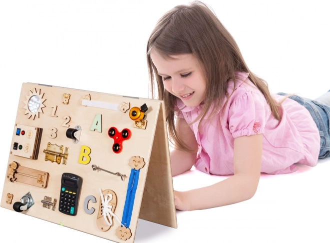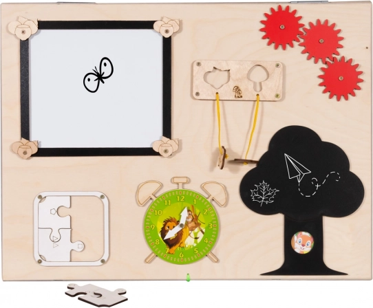 Cette planche manipulatrice en bois est pleine de divers éléments de jeu qui aident les enfants à développer leurs compétences. Les enfants peuvent jouer avec différents mécanismes interactifs qui garantissent des heures de plaisir.