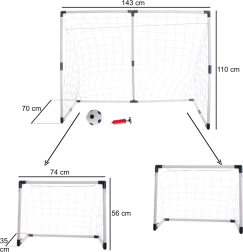 Ce but de football 2 en 1 est idéal pour les petits footballeurs qui souhaitent tester leurs compétences tant dans le jeu que lors de l'entraînement au tir au but. Son design unique permet de monter un grand but de dimensions 143x110x70 cm ou de le diviser en deux petits buts de dimensions 74x55x35 cm.