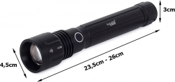 Grâce à la fonction zoom, la distance focale et la portée du faisceau sont réglables en continu, jusqu’à 1000 mètres. L’alimentation est assurée par des batteries lithium-ion 26650 de haute qualité, prolongeant l’autonomie. La lampe propose plusieurs modes d’éclairage : 100 %, 75 %, 50 %, stroboscope et SOS.
