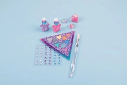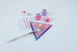 - Palette de fards à paupières, pinceau cosmétique, planche de cristaux, gloss à lèvres, 2 bagues, 2 vernis à ongles