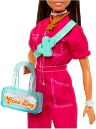 La poupée brille dans une combinaison utilitaire rose soutenu, parfaitement assortie à des chaussures blanches – une tenue idéale pour les aventures en ville.