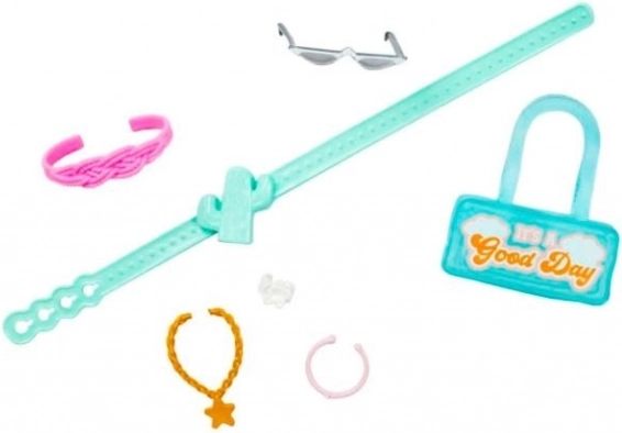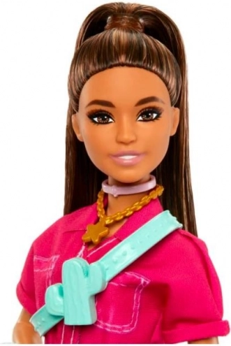 Inclus, une variété d’accessoires colorés – lunettes de soleil à demi-verres, serre-tête rose, collier étoilé, bracelet, ceinture à motif cactus et sac à main au graphisme rétro « Good Day ». La poupée ne tient pas debout seule. Les couleurs et détails peuvent varier.