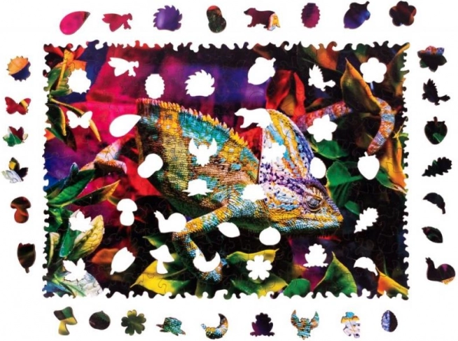 Ce puzzle design en bois de hêtre dur vous plonge dans l’univers d’un caméléon coloré et de feuillages tropicaux. Grâce à ses pièces spécialement façonnées, dont beaucoup reprennent des formes d’animaux et de plantes, l’assemblage est ludique, créatif et aussi un peu plus exigeant que les puzzles classiques.