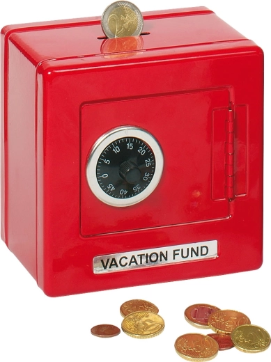 L’utilisation est simple : tournez d’abord le cadran vers la gauche d’un tour complet, puis réglez le premier chiffre du code dans le même sens. Ensuite, tournez vers la droite et réglez immédiatement le deuxième chiffre pour ouvrir la porte. Le coffre dispose d’une fente pratique pour insérer les pièces et constitue un excellent accessoire pour la chambre d’enfant.
