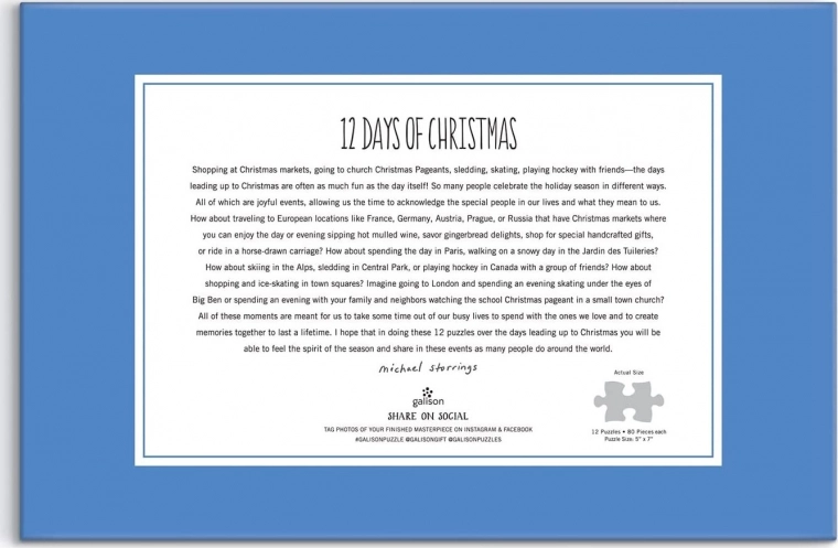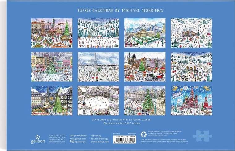 Tous les puzzles ont le même format d’environ 12,7 × 17,8 cm et se composent de 80 pièces – une durée idéale pour un rituel festif quotidien. Est également inclus un modèle recto-verso présentant les 12 motifs pour un assemblage plus aisé.