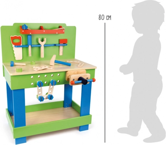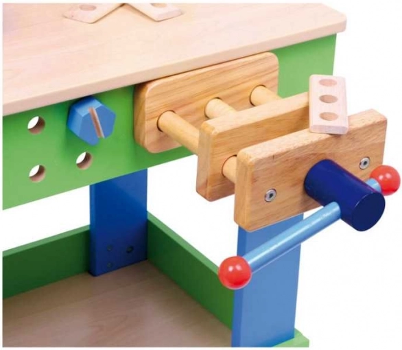 Le bureau est solidement fixé et comprend une pince à vis pour sécuriser les pièces à travailler. Les enfants peuvent s'entraîner à des compétences telles que marteler, visser, mesurer et couper.