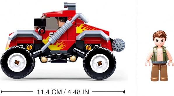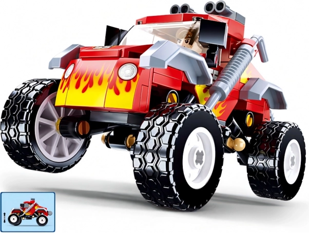 Un robuste véhicule tout-terrain rouge avec de grands pneus et des stickers flammes stimule l’imagination et les scénarios d’action sur toutes les surfaces.