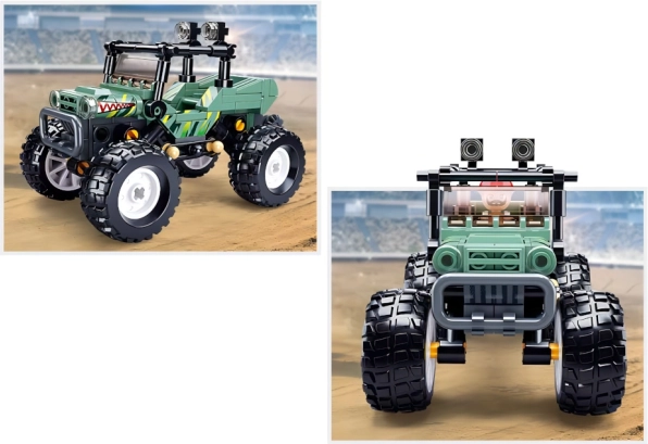 Le monster truck vert, avec ses pneus larges, sa rampe lumineuse et ses motifs percutants, garantit des courses pleines d’action même sur un « terrain » de briques.
