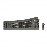 Aiguillage avec une reproduction détaillée des traverses en bois sur ballast de gravier, aux couleurs fidèles, combinant une voie droite et une courbe. Un cœur polarisé exceptionnel garantit un passage fluide.