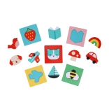 Des matériaux respectueux de la nature et sûrs pour les enfants vont de soi : les cartes sont en papier FSC et l’impression se fait avec des encres végétales (à base de soja). Le jeu offre de nombreuses variantes – les enfants peuvent chercher des objets identiques, des couleurs ou des motifs selon la carte choisie, entraînant ainsi leur logique et leur vocabulaire.