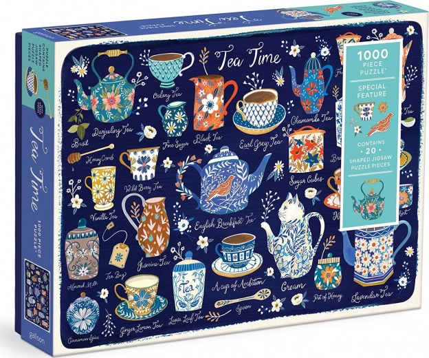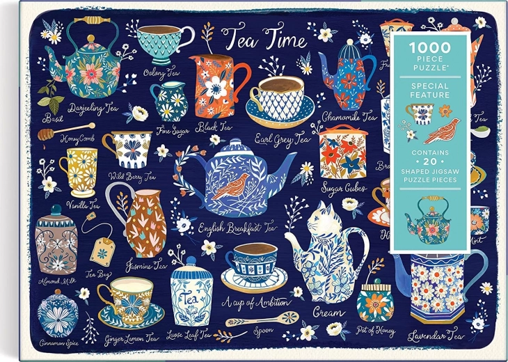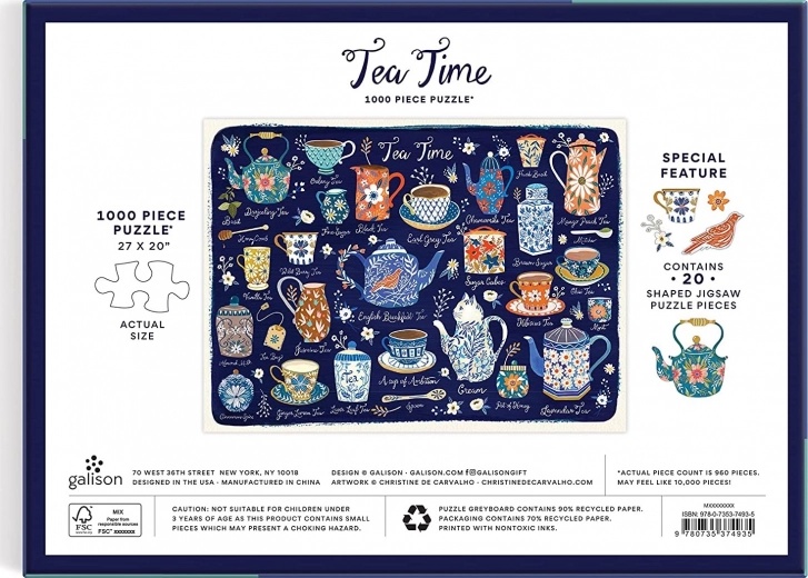 Profitez d’un moment de détente avec ce puzzle inspiré du rituel du thé. Ce puzzle de qualité de la marque Galison propose 1000 pièces découpées avec précision, 20 pièces de forme spéciale et une illustration riche en théières, tasses et cuillères. Fabriqué à partir de matériaux recyclés et durables avec une finition mate pour des couleurs fidèles et des détails nets.