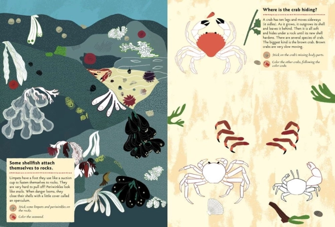 - 24 activités dont le coloriage de méduses et d’anémones, compléter le corps d’un crabe, ou dessiner des coquillages, des roseaux et des étoiles de mer