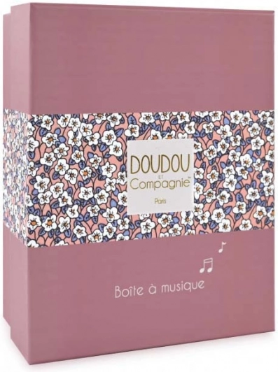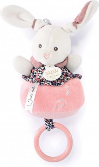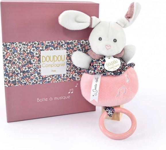 Adorable lapin rose du coffret cadeau DOUDOU, à remonter, qui joue une mélodie apaisante pour accompagner bébé vers le sommeil. Peluche douce, berceuse et boîte cadeau élégante en font un cadeau idéal pour nouveau-né.