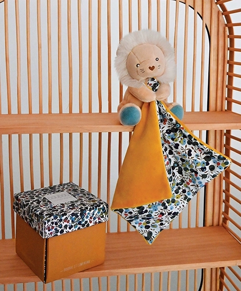 - Petit lion en peluche avec doudou dans une boîte cadeau
