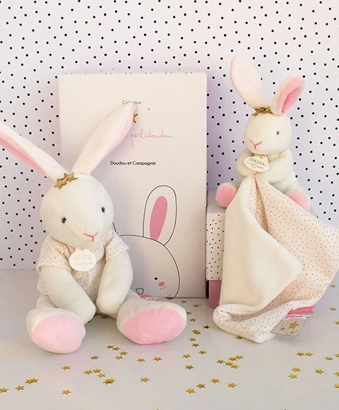 Ce coffret cadeau DOUDOU comprend un lapin en peluche blanc avec un doudou à pois au format compact de 10 cm, facile à manipuler dès les premières semaines de vie. Sa matière moelleuse et ses couleurs douces favorisent l’apaisement et l’éveil sensoriel de bébé.