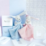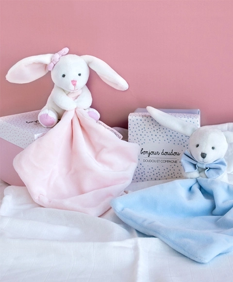 Ce lapin adorable dans une boîte cadeau élégante est un indispensable pour chaque nouveau-né. En blanc avec une couverture câlin rose, le lapin est extrêmement doux et deviendra rapidement le meilleur compagnon pour votre enfant. La petite couverture dans la patte sert de doudou facile à saisir.