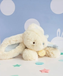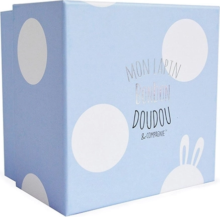 Ce lapin en peluche de couleur crème avec des oreilles bleues est présenté dans une magnifique boîte cadeau qui respire la modernité et le luxe. Cette peluche est non seulement agréable au toucher, mais elle respecte également les normes européennes CE. Idéale comme cadeau pour un nouveau-né.