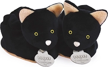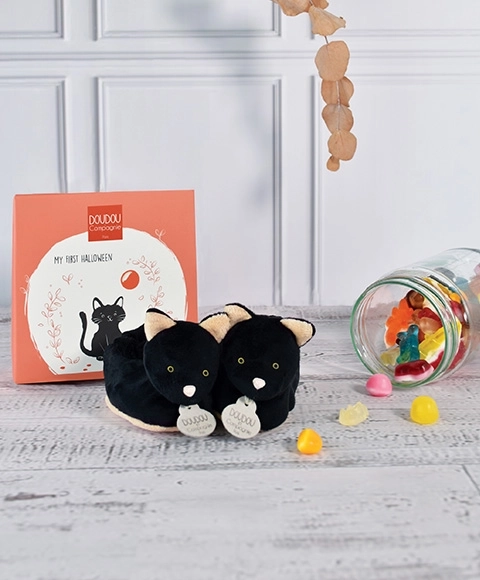 Adorables chaussons tout doux avec motif de chat noir pour bébés de 0–6 mois de la marque DOUDOU. Ils gardent les petits pieds bien au chaud, sont agréables au toucher et conviennent parfaitement pour Halloween comme pour le quotidien. Livrés dans une boîte cadeau, conformes aux normes européennes CE.