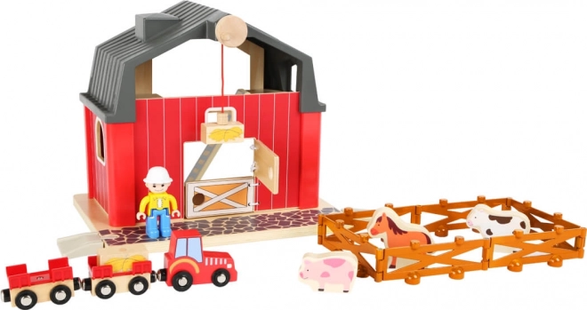 - Grange avec grue et doubles portes, tracteur avec remorque, bottes de foin (magnétiques), cheval, vache, porcelet, 6× élément d’enclos