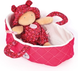Poupée Maëlle dans un sac de transport rose, douce et souple, compagnon de jeu idéal pour les tout-petits. Livrée avec un biberon, parfaite pour les promenades au parc ou les visites chez des amis.