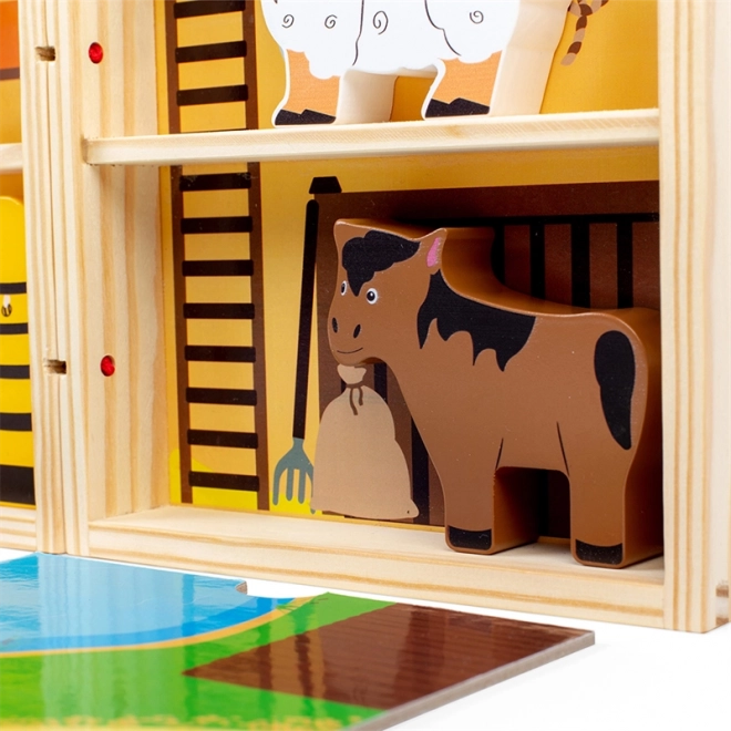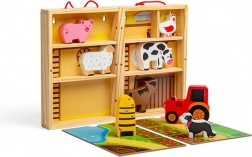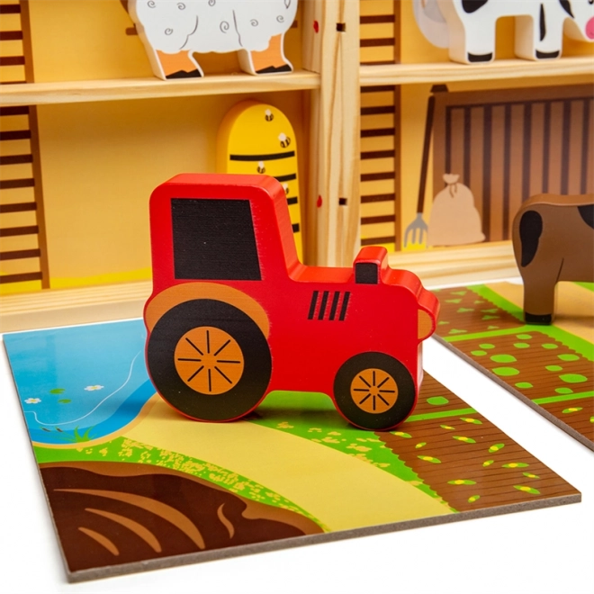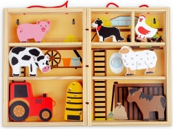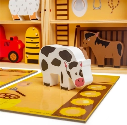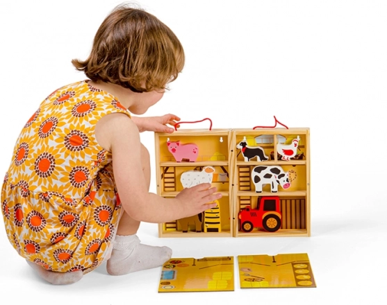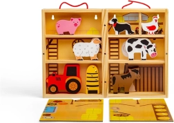 Comprend des animaux (cheval, vache, chien, cochon, mouton), une ruche et un tracteur. Couleurs vives et fabrication sûre en bois massif.