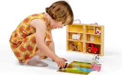 Les animaux en bois et le tracteur invitent au jeu libre. Les enfants entraînent la préhension, la coordination œil–main et la narration de leurs propres histoires.