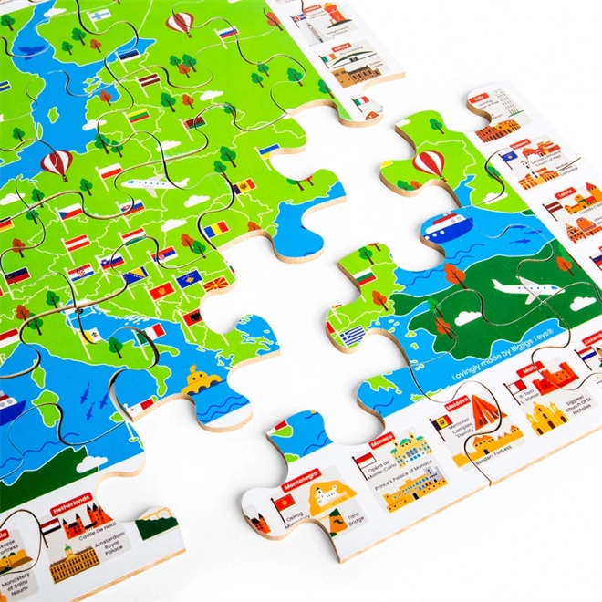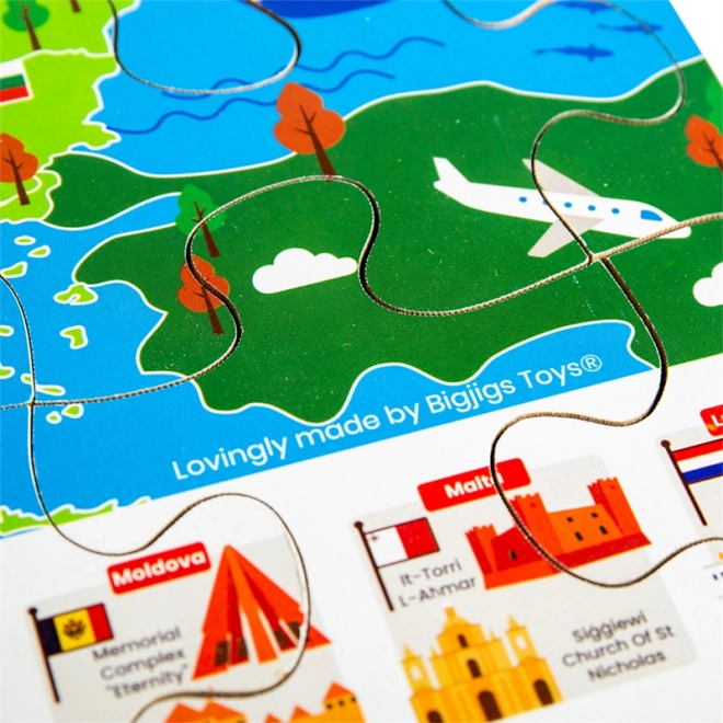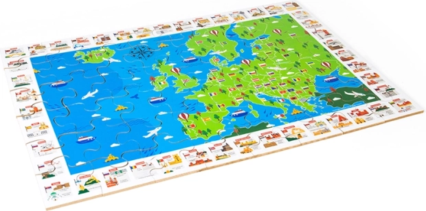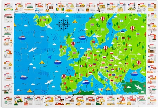 La carte colorée de l’Europe avec drapeaux et monuments emblématiques motive les enfants à découvrir les pays et leur position. L’assemblage développe la logique, l’orientation et le vocabulaire.