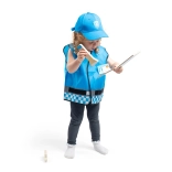 Un gilet bleu avec éléments réfléchissants et une casquette à emblème créent un look de policier authentique et favorisent les compétences sociales et de communication.