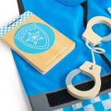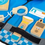 Inclus : talkie-walkie en bois, lampe de poche, menottes, badge d’identification et porte‑documents – des accessoires sûrs et robustes adaptés aux petites mains.