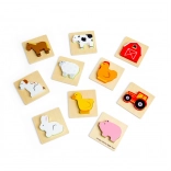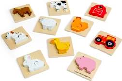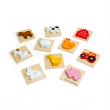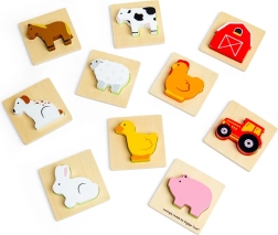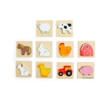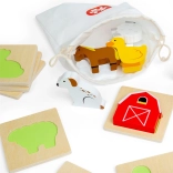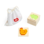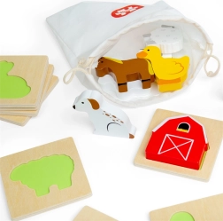 Ce jeu de voyage sur le thème de la ferme apporte aux enfants la joie de la découverte. Ils glissent la main dans la pochette en tissu et, au toucher, cherchent la pièce qui s’insère dans la base en bois correspondante. Un divertissement qui soutient discrètement la concentration, la coordination œil–main et le vocabulaire en nommant les animaux et objets de la ferme.