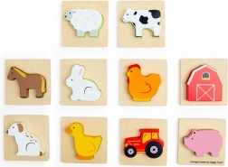 Le set comprend 8 animaux de la ferme appréciés et 2 motifs de ferme (un tracteur et une grange). Les pièces sont solides, colorées et agréables en main. Grâce à la pochette en tissu compacte, le jeu est parfait pour les déplacements, au restaurant ou chez les grands-parents.