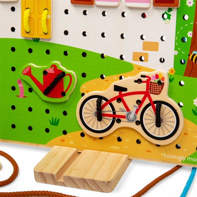 Découvrez un jeu de laçage créatif qui développe l’imagination et l’adresse des enfants. Des lacets colorés et des formes en bois comme des fenêtres, une roue ou des nuages se lacent sur une planche perforée pour composer leurs propres images. Le jouet, en bois et textile de qualité, aux couleurs vives, favorise la motricité fine, les capacités de coordination et la patience, et offre des heures de jeu.