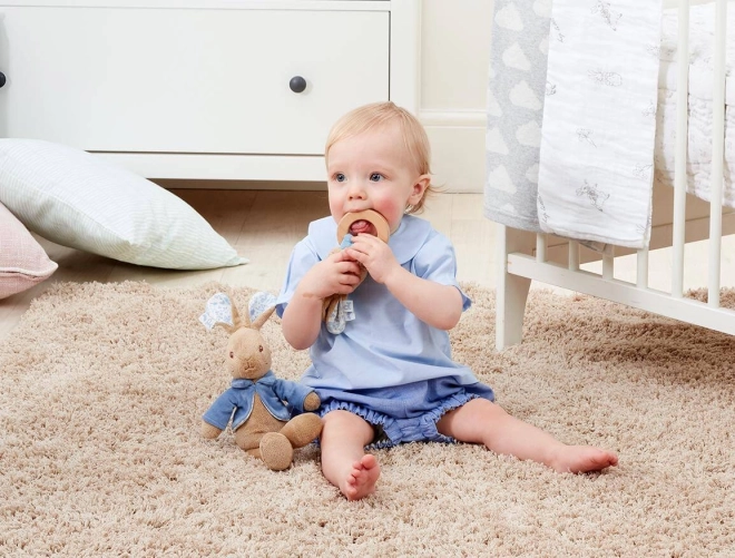 Ce hochet et anneau de dentition stylé avec le lapin Peter Rabbit favorise le développement précoce de bébé grâce à la stimulation sensorielle. Il combine une peluche douce et agréable en 100 % coton et un anneau en bois solide issu de sources durables, facile à saisir même par de petites mains.