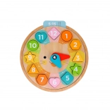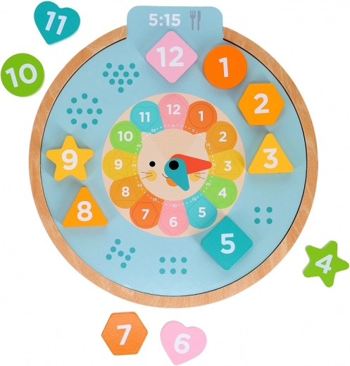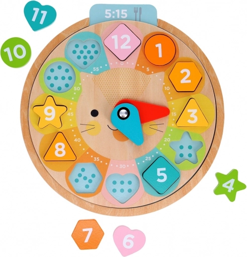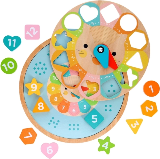 Contient des aiguilles mobiles et des formes que les enfants peuvent placer aux bons endroits, stimulant ainsi la coordination et la motricité fine.