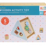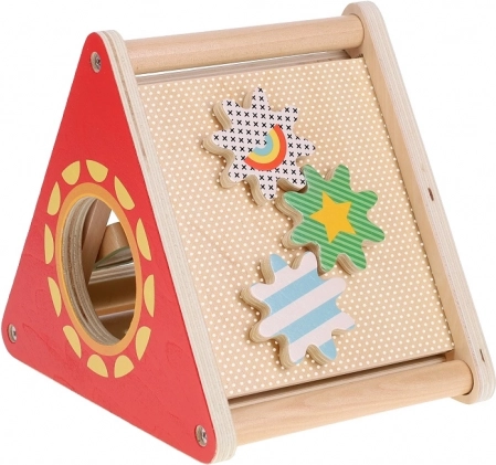 Le jouet comprend divers trous découpés pour insérer des formes et des engrenages pour développer la motricité fine.