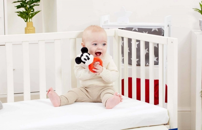 Le hochet en peluche MICKEY MOUSE, dans son coloris noir-blanc-rouge apprécié, est un compagnon idéal pour les premières découvertes. Les matières douces sont agréables au toucher, tandis que le cliquetis discret motive l’enfant à bouger, secouer et explorer.