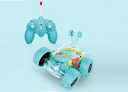 Voiture RC amusante avec un châssis transparent vertengrenages en mouvement et offrant rotation à 360° sur place, figures de cascade, effets lumineux et sonores et un contrôle facile avant/arrière et gauche/droite. Portée de la télécommande jusqu’à 10 m, vitesse maximale 5 km/h.