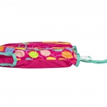 Design vibrant avec des cercles colorés sur un fond rose qui inspire les enfants à s'amuser dans l'eau.