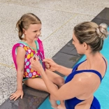 Ce gilet de natation rose pour enfants est conçu pour aider les jeunes nageurs à se sentir en sécurité et s'amuser dans l'eau. Le gilet est fabriqué en tissu durable avec UPF 50+, qui protège contre la décoloration, et contient des inserts en mousse pour une flottabilité équilibrée.